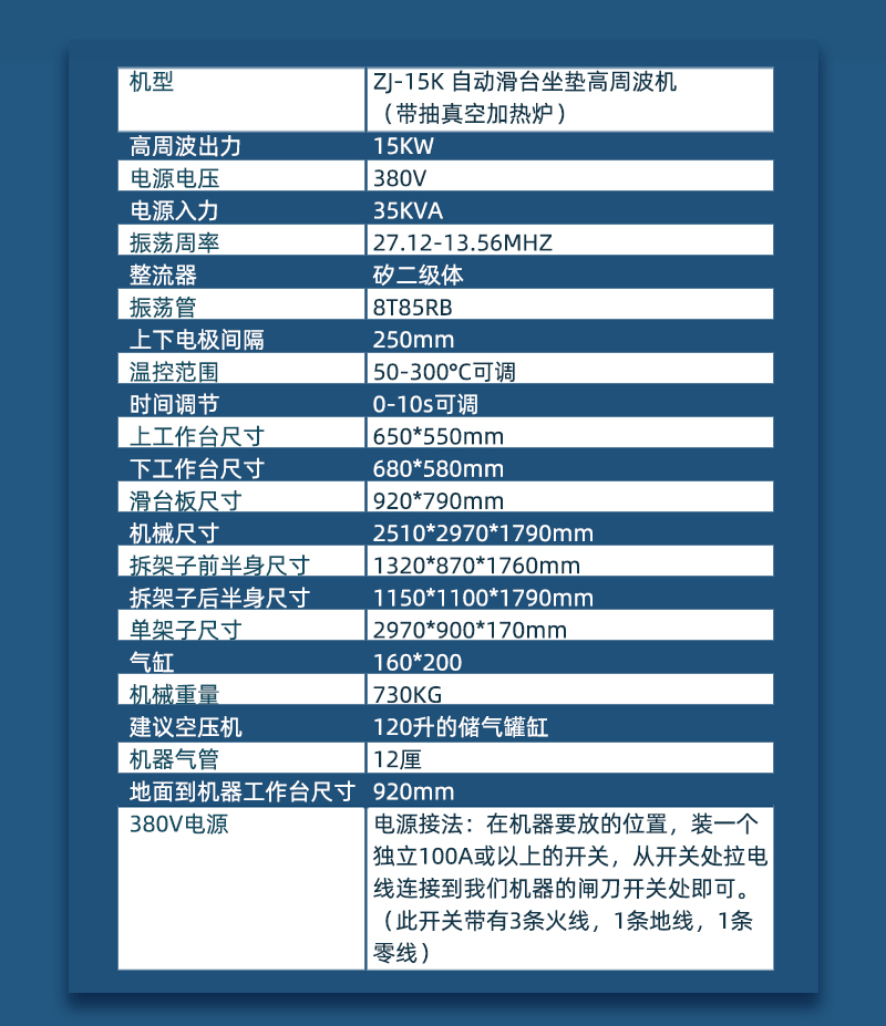 型號為ZJ-15K,此機裝有5557防火花保護裝置,對高周波模具及生產(chǎn)產(chǎn)品起到很大的保護作用。這是一款左右自動滑臺高周波機,可以單人操作,節(jié)約人工。