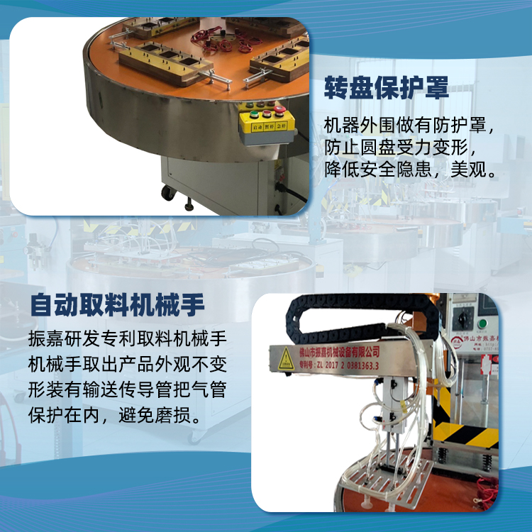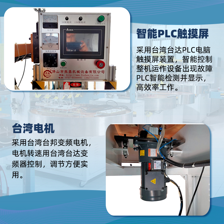 振嘉牌三工位全自動(dòng)單機(jī)械手吸塑封口機(jī),以自動(dòng)轉(zhuǎn)盤(pán)方式操作,操控簡(jiǎn)單易懂,便于維護(hù)及保養(yǎng),此機(jī)為圓盤(pán)360度旋轉(zhuǎn),分為三個(gè)工作位,即每120度為一個(gè)工作位,圓盤(pán)轉(zhuǎn)盤(pán)裝有數(shù)字化伺服控制系統(tǒng)來(lái)帶動(dòng)電機(jī)及減速機(jī),伺服系統(tǒng)能精準(zhǔn)控制圓盤(pán)轉(zhuǎn)盤(pán)速度和精度,伺服驅(qū)動(dòng)器調(diào)速的好處是方便調(diào)節(jié)伺服電機(jī),數(shù)字化顯示可調(diào)節(jié),簡(jiǎn)單易懂,高效節(jié)能,本機(jī)配有PLC觸摸屏控制
