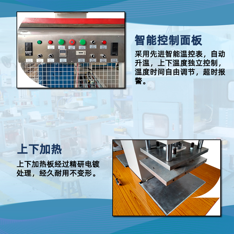 6、上下模具獨立加溫功能,自動恒溫,溫度誤差正負1度(采用平板式安裝模具方式,模具只需要安裝固定在平板上即可,簡單方便)