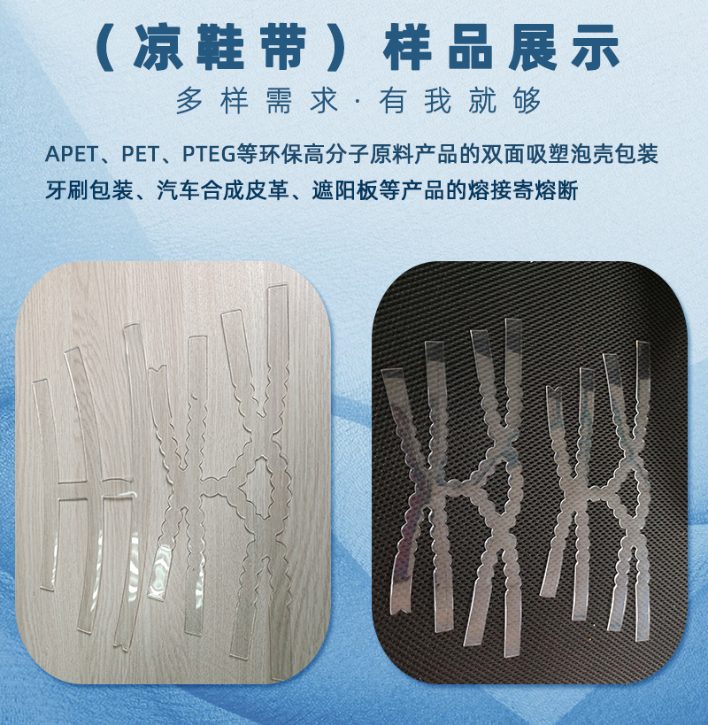 TPU涼鞋帶高周波成型機(jī)符合歐洲第4代環(huán)保標(biāo)準(zhǔn),主要用于各種塑料產(chǎn)品的成型,并將不同形狀泡罩或泡殼自動(dòng)切邊。TPU、PVC、APET、PET、PTEG等環(huán)保高分子原料產(chǎn)品的雙面吸塑泡殼包裝,的尺寸布料皮革件、商標(biāo)、手表帶、CD袋折盒壓線皮革壓花切、牙刷包裝、汽車合成皮革、遮陽(yáng)板等產(chǎn)品的熔接和熔斷。