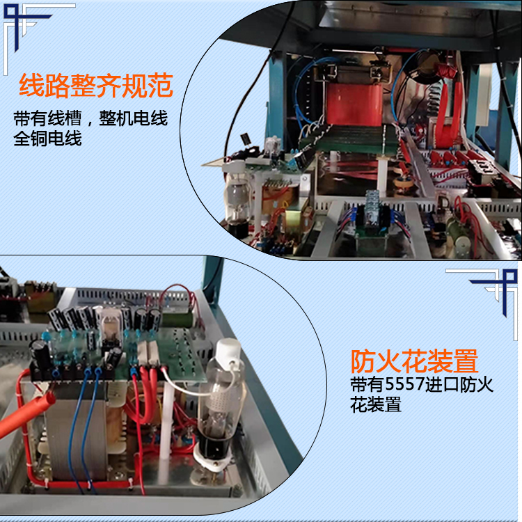 工作臺面板分左右推盤左右兩邊,操作方式是由推盤左右操作交替使用。熱合焊接過程全部由時間控制,設(shè)備設(shè)有四個時間制(下降延時---高周熔接----冷卻定型-----上升時間)。