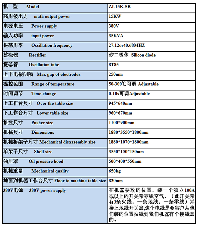 地毯壓花機(jī)設(shè)備型號為ZJ-15K-SB,也有人叫高頻高周波機(jī)此機(jī)器適合于家用門墊、汽車腳墊防滑塊、摩托車坐墊。單車座椅坐墊。耐磨片等PVC皮革踏皮熱合熔接、汽車皮革(發(fā)泡料)腳墊壓痕,還可用于汽車壓花壓標(biāo)加工,我司對地毯壓花壓字一次成型壓出效果美觀,已經(jīng)有了十幾年的經(jīng)驗,如有什么疑問和咨詢歡迎聯(lián)系我司,另還提供對所有的客戶的樣板免費(fèi)打板,對地毯壓花機(jī)提供整過程產(chǎn)品的生產(chǎn)流程及技術(shù)傳授;此機(jī)已通過歐盟CE質(zhì)量出口檢測認(rèn)證,可放心使用。