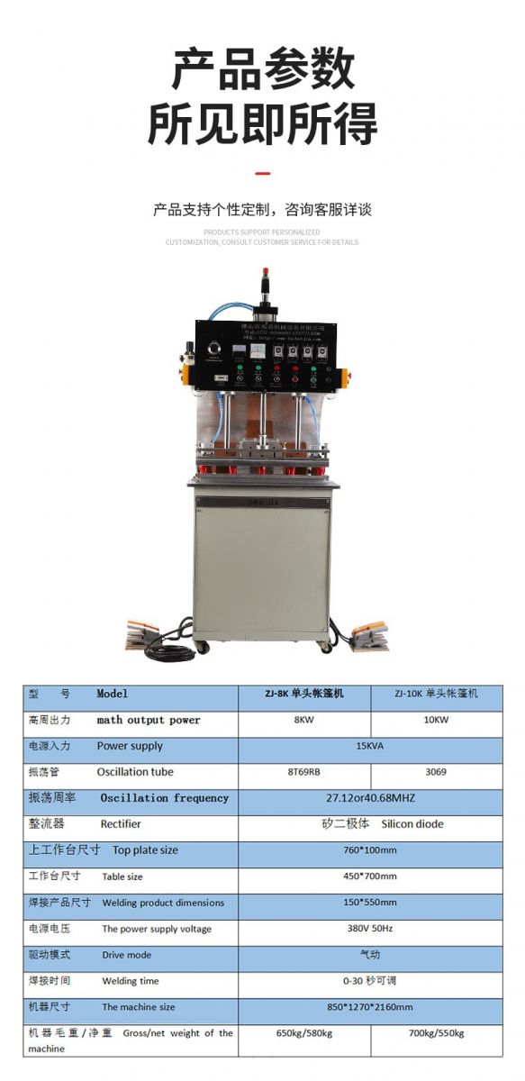可根據(jù)用戶需要,選擇不同高周波功率大小的機(jī)器,每次焊接帆布材料的長(zhǎng)度及寬度,均可以通過(guò) 改變高周波模具的尺寸長(zhǎng)短寬度實(shí)現(xiàn)帆布熱合需要。不同的帳篷焊接機(jī)的內(nèi)側(cè)設(shè)有相應(yīng)跨度的帆布放料。以滿足大面的汽車篷帆布、戶外帳篷布、電影幕布、膜結(jié)構(gòu)、戶外遮陽(yáng)布、戶外廣告噴繪布、PVC布的熔接接駁。高頻機(jī)的鐳射定位為可選配置,方便每次焊接時(shí)定位