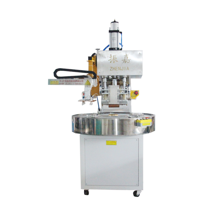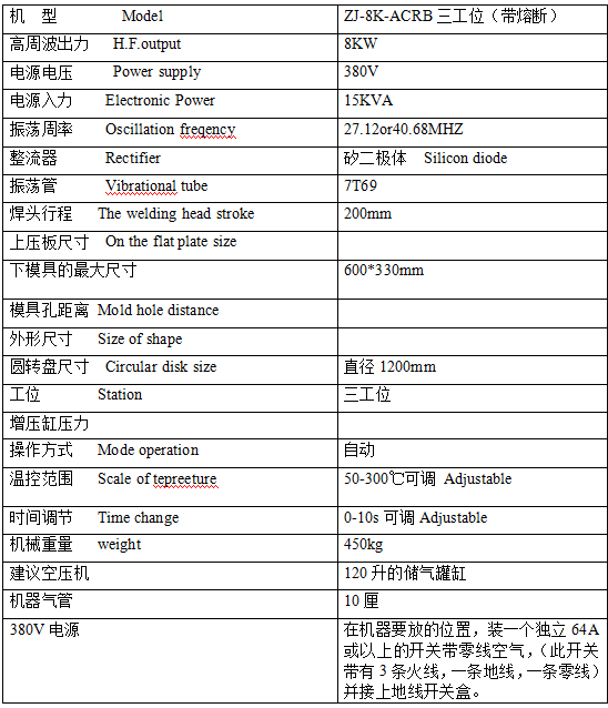 PET全自動(dòng)高周波機(jī)型號(hào)為ZJ-8K-ADRB3,此機(jī)裝有5557防火花保護(hù)裝置,對全自動(dòng)圓盤高周波機(jī)模具及生產(chǎn)產(chǎn)品起到很大的保護(hù)作用,是一款三工位圓盤轉(zhuǎn)的 PET全自動(dòng)圓盤高周波機(jī),可以單人操作,節(jié)約人工;由振嘉機(jī)械設(shè)備有限公司 PET全自動(dòng)圓盤高周波機(jī)生產(chǎn)廠家專業(yè)制造,機(jī)器質(zhì)量已通過歐盟CE質(zhì)量出口檢測; PET全自動(dòng)高周波機(jī)以自動(dòng)轉(zhuǎn)盤方式操作,上下模對位準(zhǔn)確,高頻,操控簡單易懂,便于維護(hù)及保養(yǎng),本機(jī)配有觸摸屏控制整機(jī)動(dòng)作、內(nèi)置PLC工控集成系統(tǒng),可便于以后更改機(jī)械控制程序或擴(kuò)展其它機(jī)械應(yīng)用功能、此系統(tǒng)符合機(jī)械操作應(yīng)用、也是現(xiàn)代化機(jī)械之趨勢。