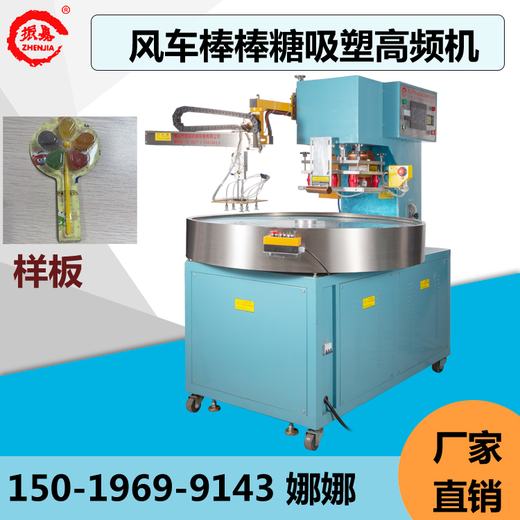 風車棒棒糖吸塑高頻機帶有拾取機械手可以配合流水式生產使用,使工廠企業(yè)降低成本、節(jié)省人工、提高效益的好幫手。