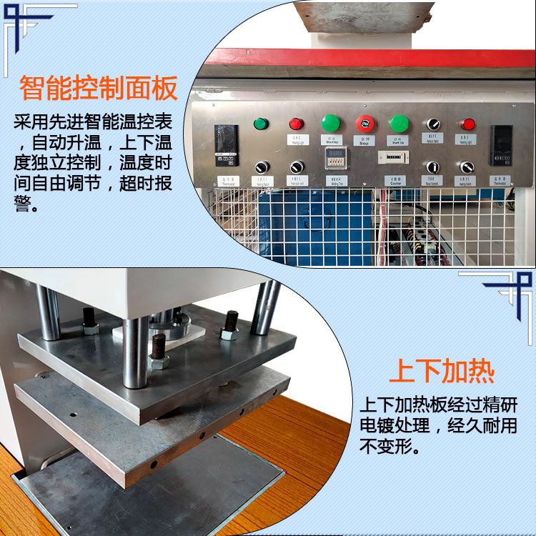 6、服裝壓花機(jī)上下模具獨(dú)立加溫功能,自動(dòng)恒溫,溫度誤差正負(fù)1度(采用平板式安裝模具方式,模具只需要安裝固定在平板上即可,簡(jiǎn)單方便)