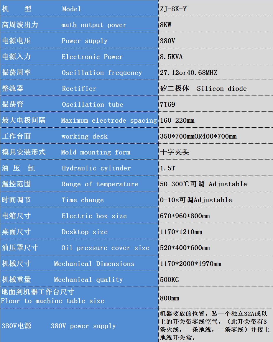 皮革壓印高頻機(jī):操作工作臺(tái)面板分別為機(jī)頭的兩邊,操作方式主要是由操作人員右腳踏定位和左腳開關(guān),焊接過程由時(shí)間自動(dòng)控制,左右機(jī)頭交替使用。皮革壓印高頻機(jī)機(jī)型主要有ZJ-5K-Y,ZJ-8K-Y,ZJ-10K-Y。