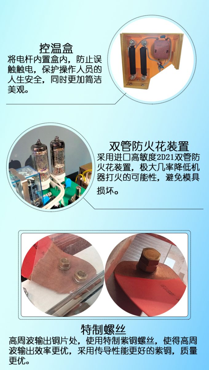 1、皮革壓印高頻機(jī)此機(jī)裝有防火花保護(hù)裝置,能有效保護(hù)模具及產(chǎn)品之缺損,從而大大減少燒壞模具機(jī)率,采用國(guó)際大品牌原裝OMROM(歐姆龍)繼電器及臺(tái)灣正宗CKC時(shí)間制,能保證機(jī)器長(zhǎng)時(shí)間的頻率工作,并大大延長(zhǎng)機(jī)器壽命,減少機(jī)器故障。