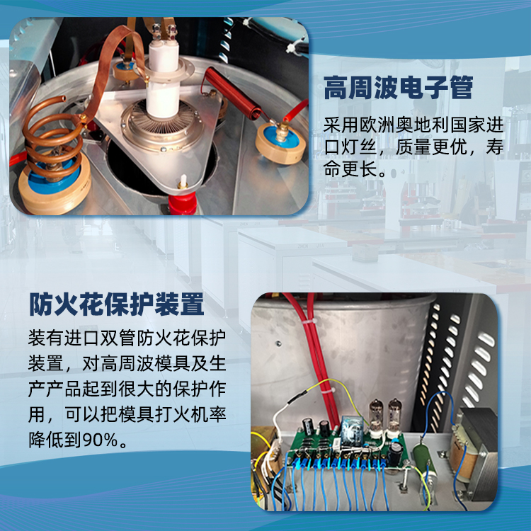 1.雙頭式高周波機型號為ZJ-8K-Y,此機裝進口雙管防火花保護裝置,對高周波模具及生產(chǎn)產(chǎn)品起到很大的保護作用,