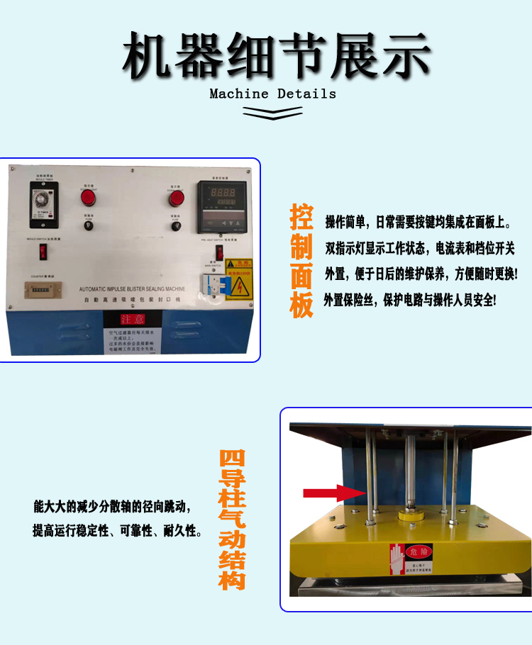 4.上熱式吸塑包裝封口機(jī)機(jī)體結(jié)構(gòu)堅(jiān)實(shí)、可靠、耐用。