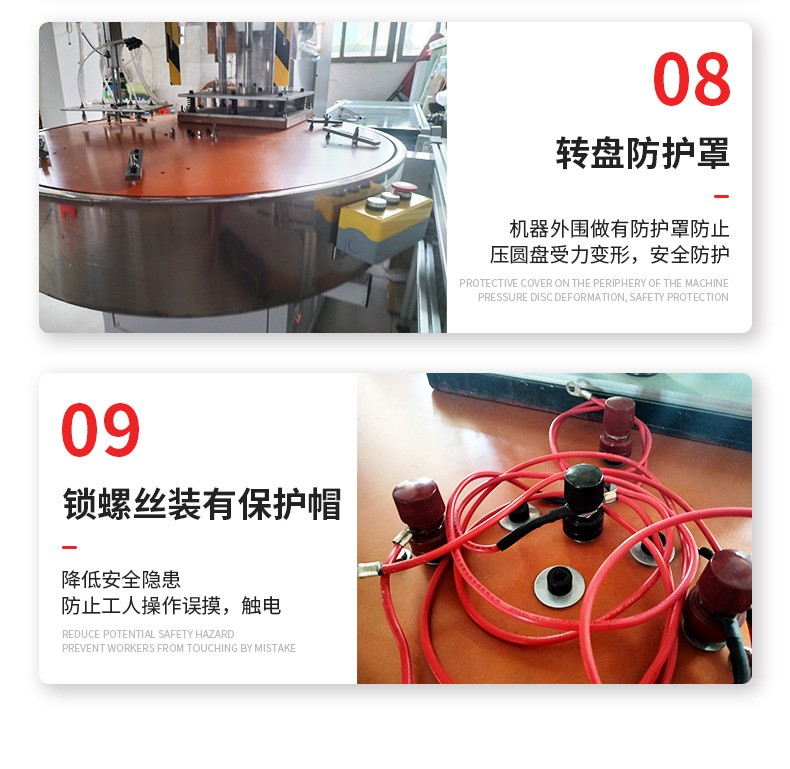 1.操作簡便:只要選擇延時時間、加熱時間與冷卻時間及加熱電流轉(zhuǎn)換檔位,轉(zhuǎn)盤自動旋轉(zhuǎn),人工放材料及產(chǎn)品,壓好產(chǎn)品自動轉(zhuǎn)到機(jī)械手位置,機(jī)械手取出產(chǎn)品,機(jī)器的延時系統(tǒng)、加熱系統(tǒng)及冷卻系統(tǒng)便會自動操作,完成封合過程。