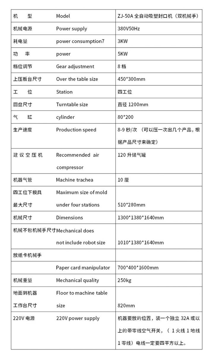 手機(jī)殼自動吸塑包裝機(jī)采用PLC編程觸摸屏操作控制,功能清晰調(diào)節(jié)方便,自行開發(fā)電腦控制系統(tǒng),抗干擾能力強(qiáng),度可達(dá)到0.01秒,圓盤式多工位結(jié)構(gòu),利用分割器,定位準(zhǔn)確,效率高。本機(jī)采用雙機(jī)械手自動放紙卡取料裝置,可連續(xù)自動放卡紙、焊接成型、連續(xù)自動取料可安裝到生產(chǎn)線上使用,大大提高了生產(chǎn)效率,避免了操作人員在塑料焊接下直接工作,使操作人員處于更安全的保護(hù)狀態(tài)之中,可有效地減少工傷事故的發(fā)生。手機(jī)殼自動吸塑包裝機(jī)型號為ZJ-50A(雙機(jī)械手),全機(jī)均為全自動化帶有自動取料及自動取紙卡雙機(jī)械手,工作臺可以放置模具數(shù)量為:四套模具,此新一代全自動雙機(jī)械手吸塑封口機(jī)專為替代傳統(tǒng)手動吸塑封口機(jī)和鏈條式吸塑封口機(jī)而設(shè)計。