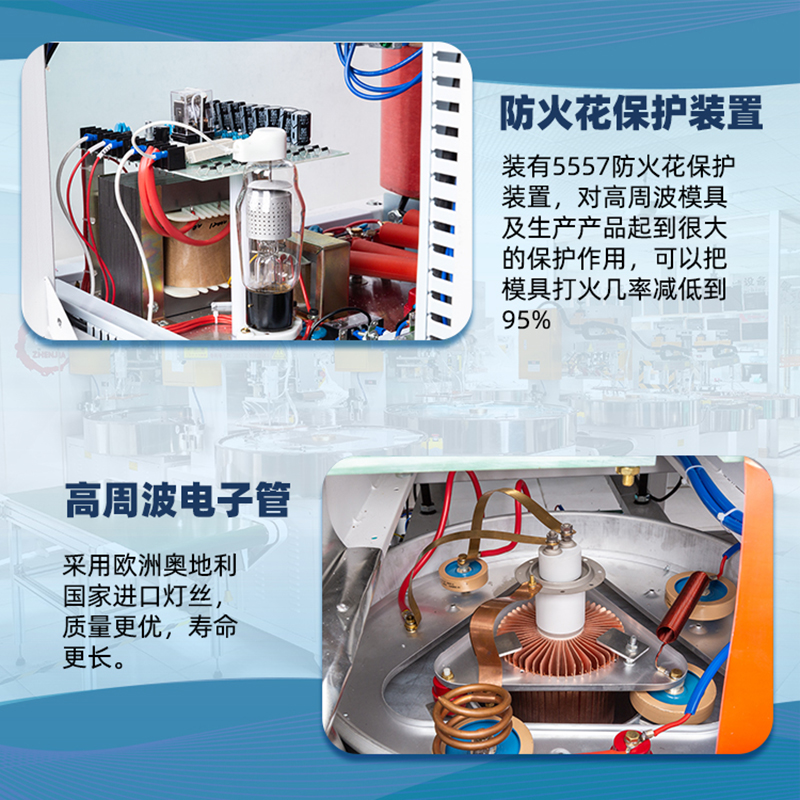 此機裝有高敏度5557防火花保護裝置,可以把模具發(fā)生火花的機率降低95%,對高周波模具和產品起到很大的保護作用。這臺機器可以單人操作,節(jié)約人工成本。它由振嘉機械設備有限公司專業(yè)制造,機器質量已通過歐盟CE質量出口檢測和ISO9001機器質量檢測;此外,我們公司提供免費打板打樣服務,可提供產品生產整過程工序及生產方案