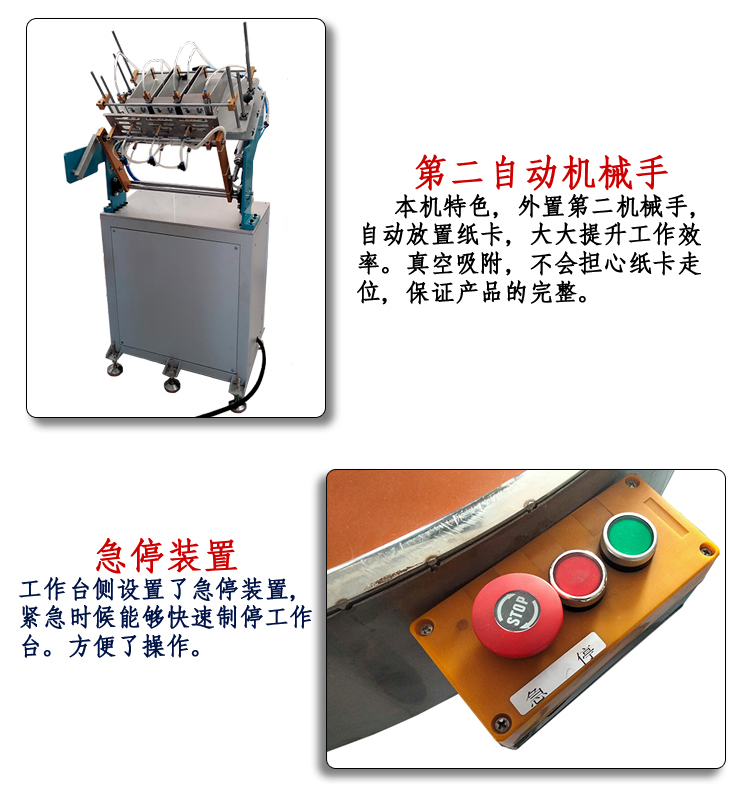 順德五金吸塑包裝機此機只需要一個工人操作,而且只重復(fù)做一個動作就可以,避免工人出錯,工人包裝時只需要把吸塑和包裝的物品放在模具上,取紙卡機械手自動把紙卡放在模具內(nèi),壓合好后取料機械手會自動把壓合包裝好的產(chǎn)品取出來,節(jié)省了一個放紙卡和取料工人,不像傳統(tǒng)的鏈條式吸塑封口機要做12套模具從而增加了模具成本