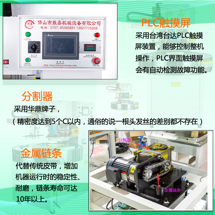 1.圓盤(pán)工作臺(tái)自動(dòng)平穩(wěn)旋轉(zhuǎn),定位精準(zhǔn),是采用分割器進(jìn)行角度的定位(精度達(dá)到5個(gè)C以?xún)?nèi),通俗的說(shuō)一根頭發(fā)絲的差別都不存在),工件熱合邊整體標(biāo)準(zhǔn)和均衡,從而上下模具可以設(shè)計(jì)導(dǎo)柱對(duì)位,實(shí)現(xiàn)快速換模大大節(jié)省時(shí)間(手動(dòng)轉(zhuǎn)盤(pán)機(jī)采用卡槽定位虛位比較大,而且在使用過(guò)程機(jī)械摩擦虛位還會(huì)不斷加大,導(dǎo)柱對(duì)位就不太合適)。