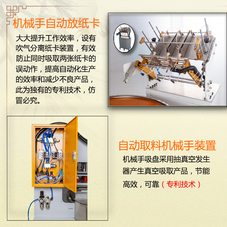吸卡熱壓機(jī)設(shè)有吹氣分離紙卡裝置,有效防止同時(shí)吸取兩張紙卡的誤動(dòng)作,提高了自動(dòng)化生產(chǎn)的效率和減少不良品,此為獨(dú)有專利技術(shù),防冒必究。