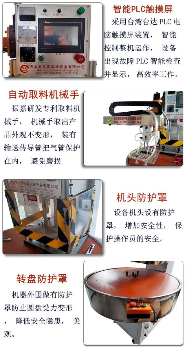 ②、機(jī)械手自動(dòng)取料, 機(jī)械手自動(dòng)取料可以解決壓好的工件由于溫度還未散熱,如果人手取料會在拿取工件邊的時(shí)候由于工件邊緣剛熱合完還沒完全冷卻受力拉扯就會彎或變形,影響了產(chǎn)品的美觀,機(jī)械手采用平行式真空吸盤取料,熔接邊平整不彎,提升質(zhì)與量的效果。